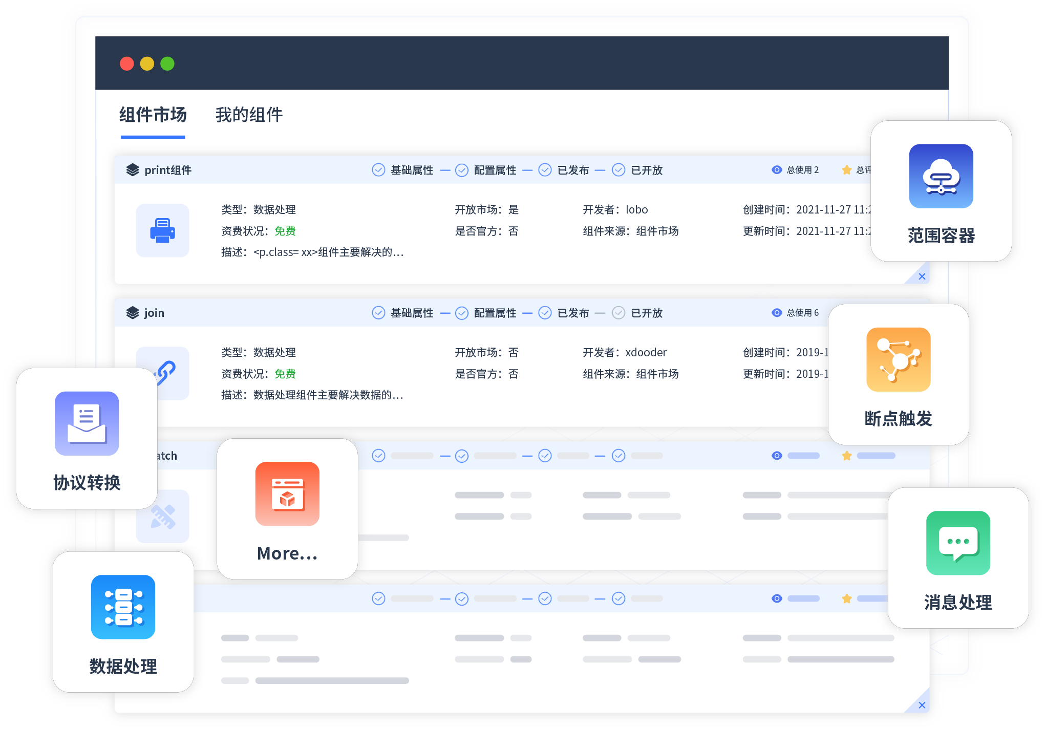针对集成场景,hg57体育提供组件市场,例如协议转换、消息处理、文件操作等。除平台提供的组件外,客户可以自定义所需组件。